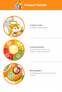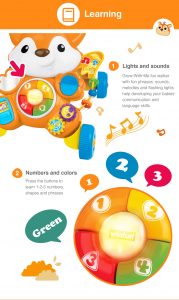 - Flashing lights, cheerful melodies & sound effects for entertainment