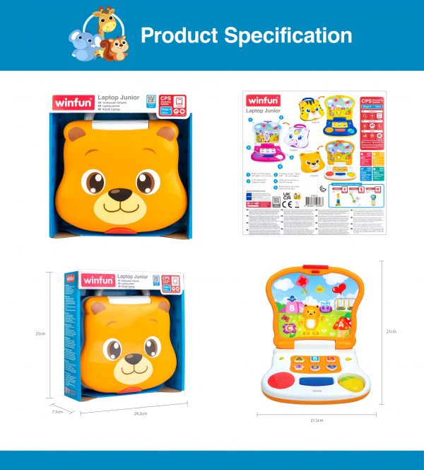 Laptop Junior – Bear is an adorable early learning toy designed to make education fun for toddlers. Features a magical screen that keeps little ones engaged during play. Offers 2 interactive modes: one for teaching ABCs, numbers, and shapes, and another for musical fun. The music space bar plays cheerful melodies, adding excitement to learning. Includes a clicking toy mouse for realistic computer-like interaction, encouraging role-play and fine motor skill development. Powered by 2 “AA” batteries (included) for instant playtime.