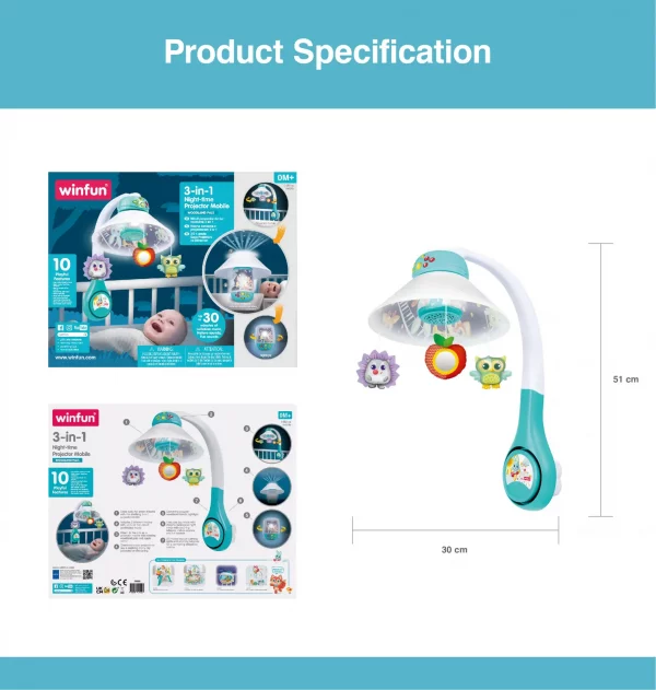 The 3-in-1 Night-time Projector Mobile is designed to create a relaxing and comforting bedtime environment for your baby. It offers 3 versatile modes: a crib mobile with rotating woodland pals, a star projector that casts a gentle starry sky, and a nightlight featuring sweet woodland friends. With both day and night modes, this mobile plays cheerful tunes during the day and soothing lullabies, nature sounds, and gentle effects at night, helping to calm and comfort your baby. The projector provides up to 30 minutes of continuous music and calming lights, perfect for easing little ones into a peaceful sleep routine. Safe and simple to use, this mobile grows with your child and transitions easily from a crib mobile to a standalone projector or nightlight. Suitable for newborns from 0 months and up, it makes a wonderful sleep-time companion.