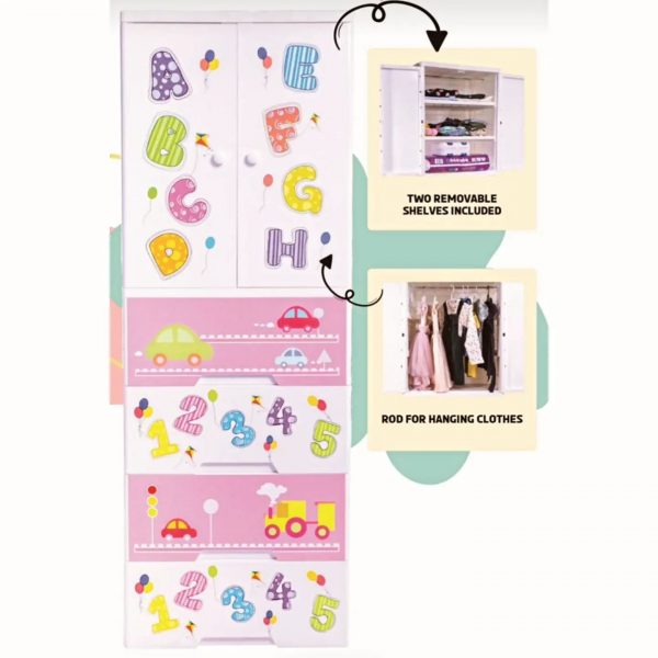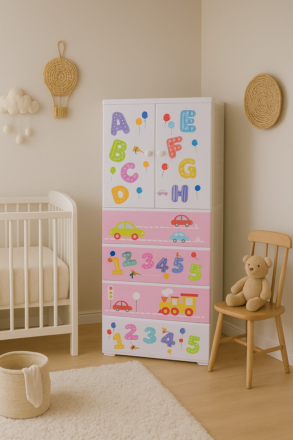 The ABC Theme 7 Layer Wardrobe is a spacious and colorful storage solution engineered to organize a child’s room efficiently. Constructed from high-quality, durable imported plastic material, this robust unit is built for long-term use. The 7-Layer configuration (Model # 4022) provides extensive storage capacity (L41 x W61 x H171 cm), featuring four generous pull-out drawers and a large three-layer cabinet section. This wardrobe is designed to neatly contain everything from garments to books and toys. The cabinet area includes a sturdy hanging rod for clothes and two adaptable, removable shelves. For enhanced user convenience, the drawers are equipped with safety stoppers, and the entire unit can be effortlessly moved across the room using the integrated wheels.