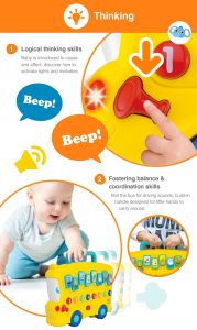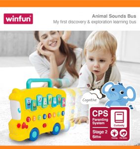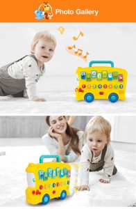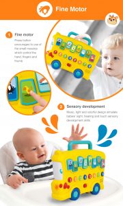Designed for children aged 6 months and above, this battery-operated toy (2 “AAA” batteries included) combines fun, learning, and interactive play in one colorful, engaging bus.