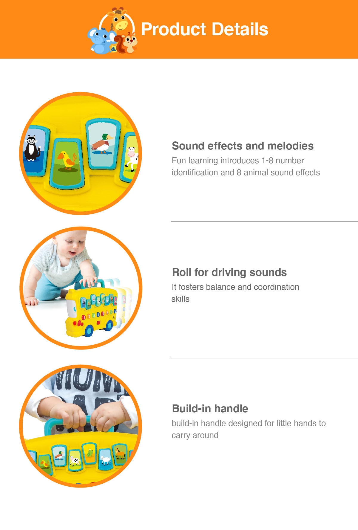 The Animal Sounds Bus is an engaging and educational toy for young children. Its free-wheeling design and built-in handle make it easy to carry and push, encouraging motor skills and coordination. The bus features number buttons from 1-8, helping children learn counting through interactive play. Additionally, it plays 8 different animal sounds and cheerful melodies, enhancing auditory development and musical interest. Rolling the bus produces realistic driving sounds, adding to the fun and imaginative play experience.