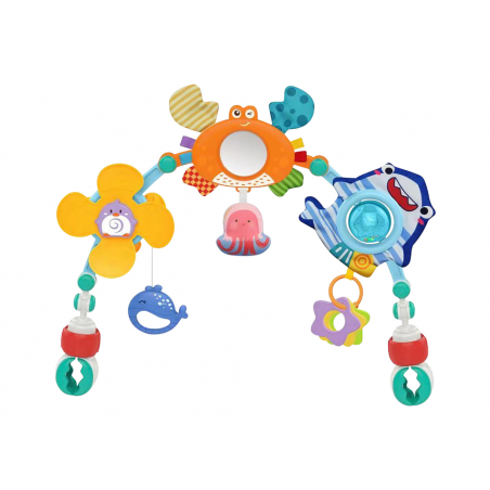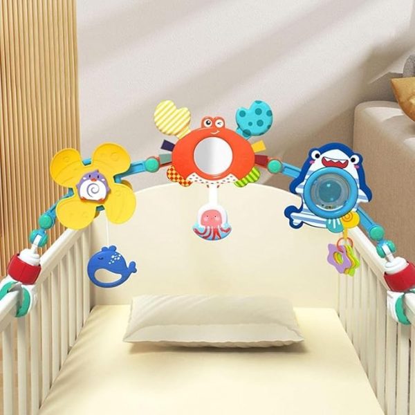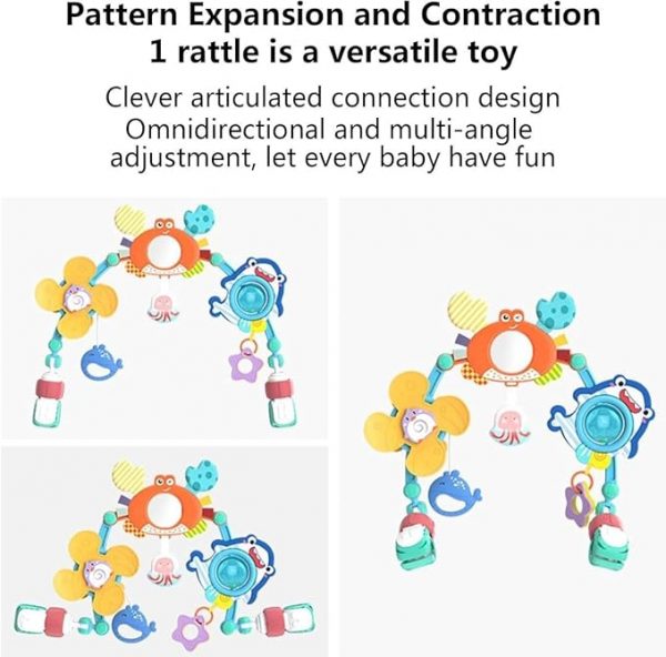 β’ Features: Mirror spinner, rattles, teether, beaded spinner, rustling octopus, flexible attachment design