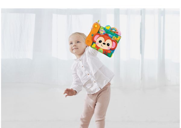 Jungle Animals Sensory Book is a delightful soft toy designed to entertain and comfort babies from 3 months and up. Features a textured teether to gently soothe gums during teething. Includes engaging play elements like a crinkle peekaboo page, baby-safe mirror, and squeaker for multi-sensory fun. Light-up button and animal designs (bird, banana, etc.) play cheerful sounds and melodies, keeping little ones entertained. Convenient ring attachment makes it easy to carry and secure on strollers, cribs, or car seats. Equipped with an on/off switch and Hi/Lo volume control, allowing parents to adjust playtime settings. Runs on 2 βAAAβ batteries (included).