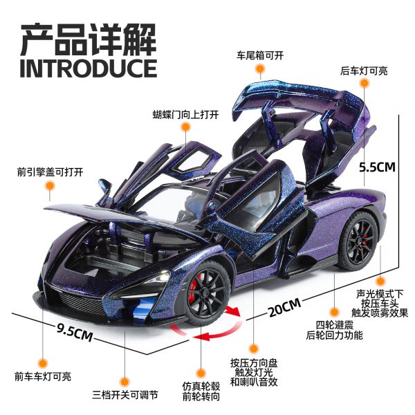 Pay tribute to a racing legend with the 1:24 scale McLaren Senna, a diecast model that embodies the spirit of track-focused performance. Meticulously crafted from high-quality alloy metal, this replica captures the Sennaβs extreme aerodynamic design, from its aggressive front splitter to its distinctive rear wing. Engineered for durability and a premium feel, the model features an interactive electric system powered by a button battery, bringing the car to life with light and sound effects. Whether you are a dedicated hobbyist or a young fan of high-speed supercars, this McLaren Senna is a precision-engineered masterpiece that stands out in any collection.
