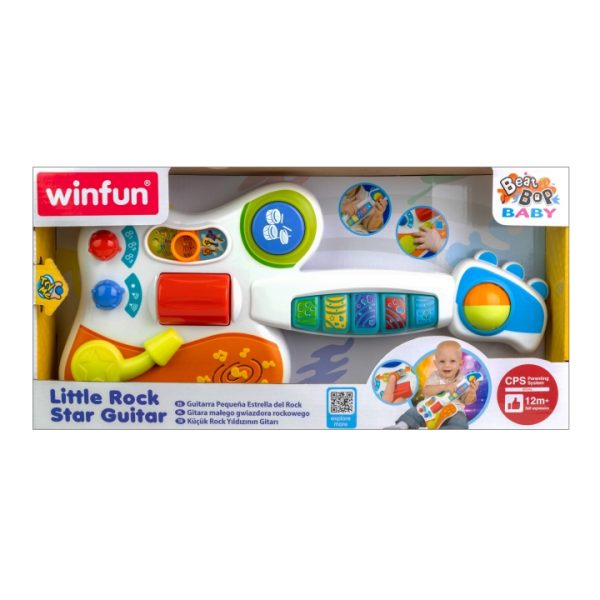 The Little Rock Star Guitar is designed to bring the joy of music to toddlers, making playtime both entertaining and educational. Features 5 easy-note key buttons with flashing lights that encourage little hands to explore music. Offers 3 modes of play: Free Play for creativity, Play Right Mode for guided play, Demo Mode with preprogrammed songs. Equipped with a strum button and whammy bar for fun, zany sound effects. Includes a large drum sound button to add variety and rhythm to playtime. A music/instrument selection knob allows kids to switch between sounds for more interactive learning. Runs on 3 βAAβ batteries (included).