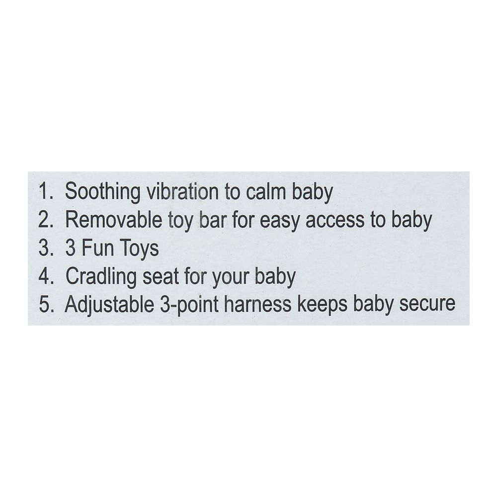 β Features: Soothing vibration, removable toy bar, 3 fun playthings, adjustable 3-point harness, cradling seat