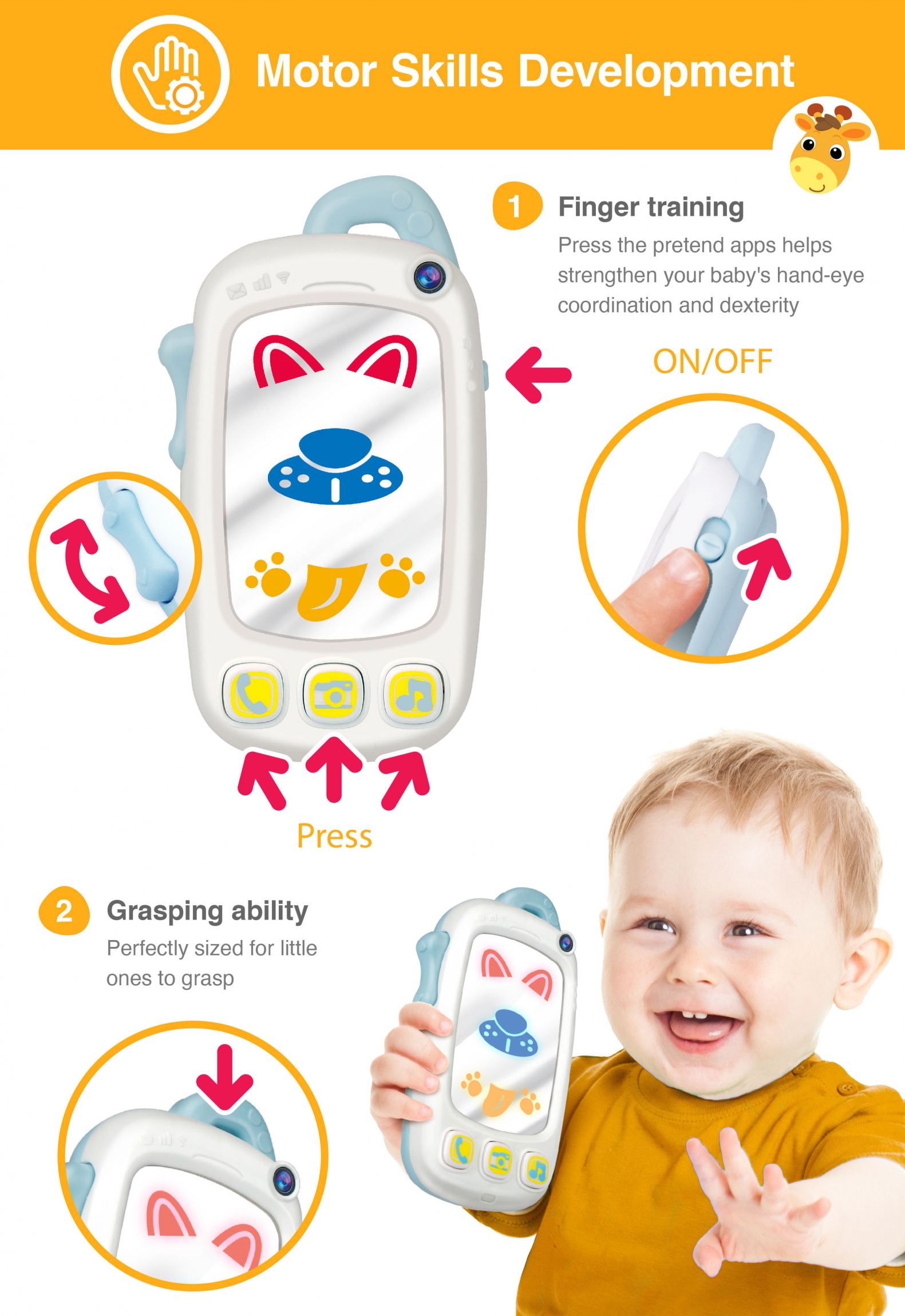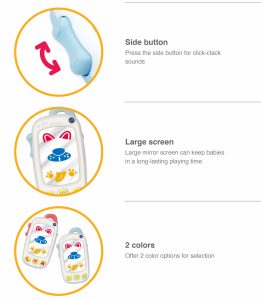 The My First Baby Selfie Phone (B) is a playful interactive toy that introduces babies to imaginative role-play. Designed like a fun baby phone, it features a light-up mirror and colorful easy-press buttons. Pressing the camera icon reveals funny effects, while cheerful tunes, phrases, and engaging sound effects keep little ones entertained. A side button creates click-clack sounds, enhancing sensory play and adding realistic details. Compact and safe, it helps develop fine motor skills, hand-eye coordination, and early cause-and-effect learning. Powered by 3 “AAA” batteries (included), this baby phone is perfect for children aged 9 months and above.