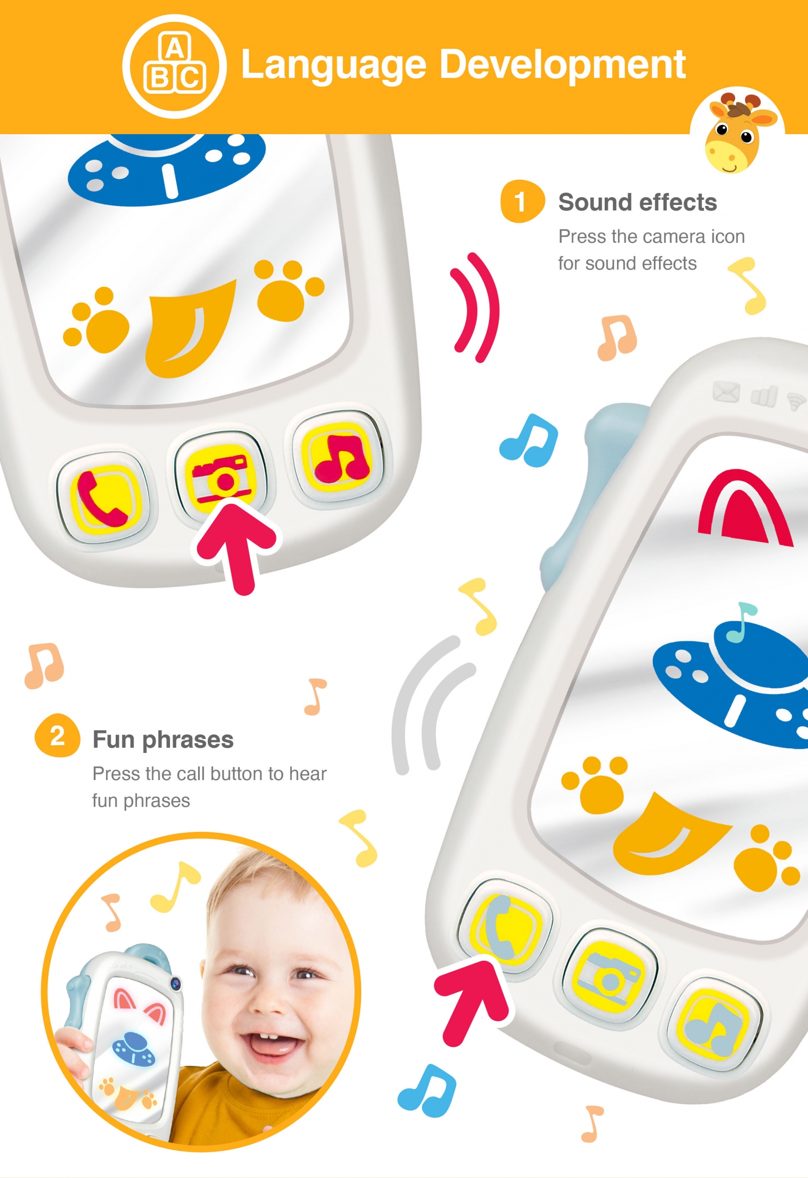 - Plays phrases, cheerful tunes & sound effects