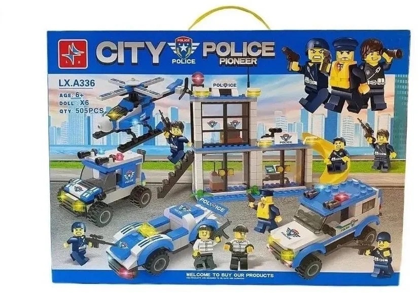 β’ Features: Dual police stations, helicopters, cars, portable box with lid baseplate