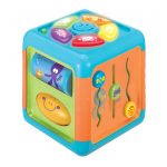 - Multi-activity discovery cube with 5 light-up buttons producing animal sounds and melodies
